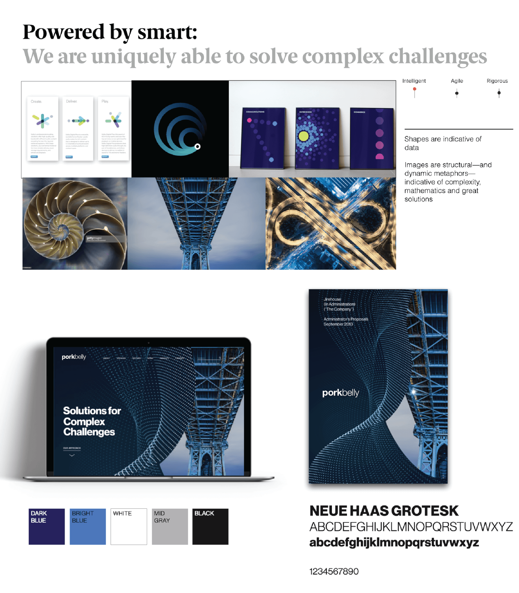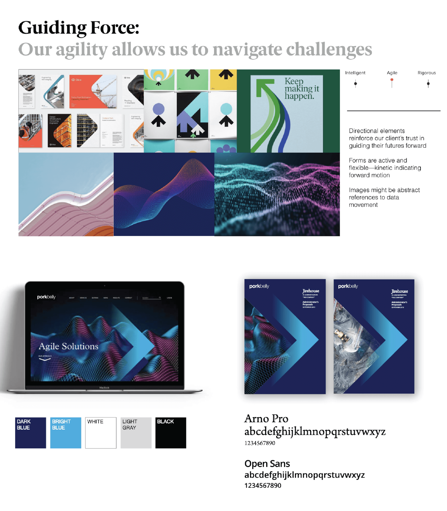 Finally, we use our agreed-upon design building blocks to explore design territories. Design territories are thematic groupings of visuals that explore each of the principles using the design elements we’ve identified for each principle. The following images demonstrate how three guiding principles — in this case intelligent, agile, and rigorous — can be expressed as design territories.
