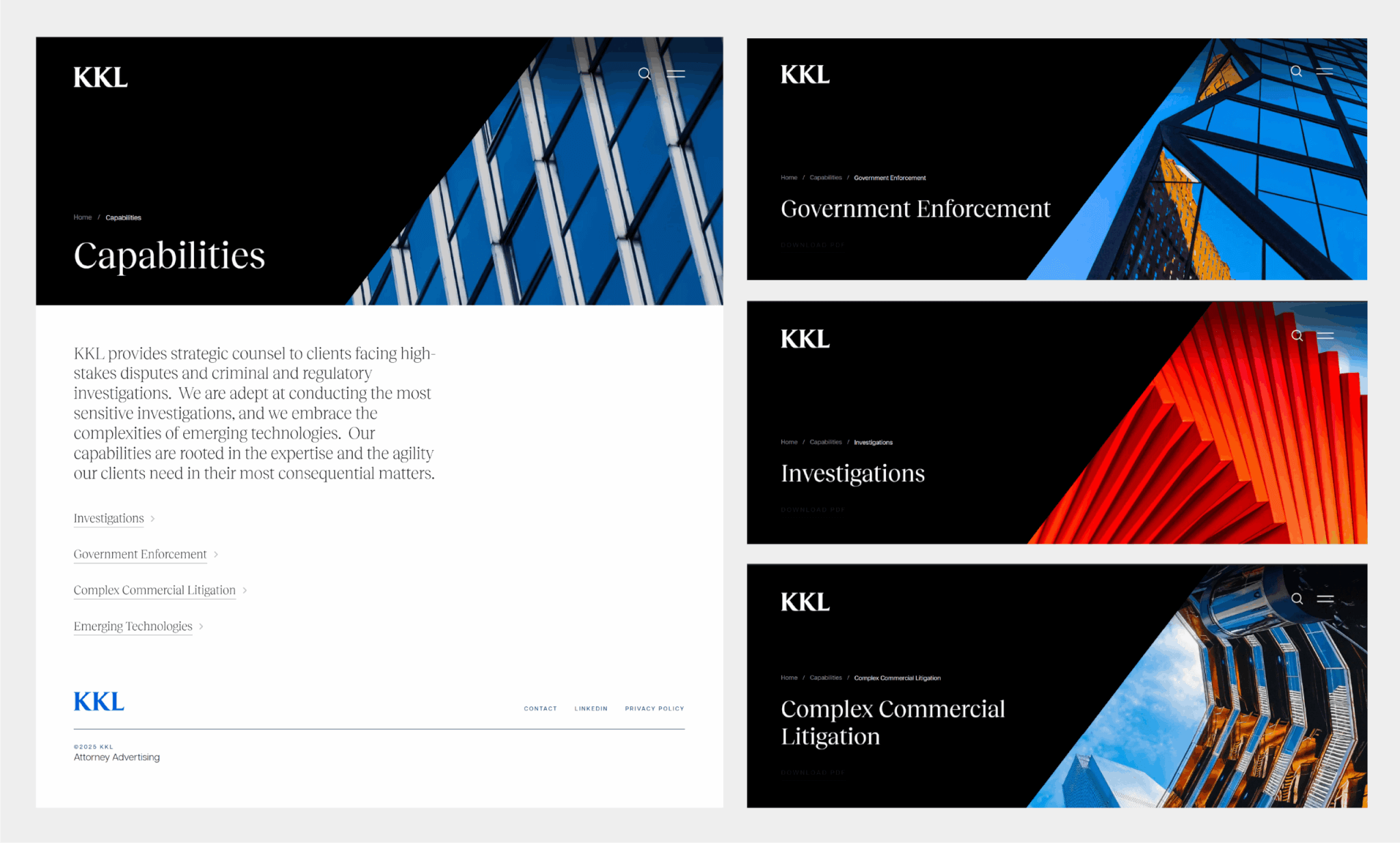 Decker Design repositioned KKL as a modern, prestigious litigation boutique by redefining its brand narrative, restructuring the site architecture, and introducing a contemporary visual identity. Messaging elevated the firm’s dual strengths—elite enforcement experience and high-stakes civil litigation—while new photography, streamlined content, and enhanced career sections reflected the firm’s culture, talent, and growth ambitions.