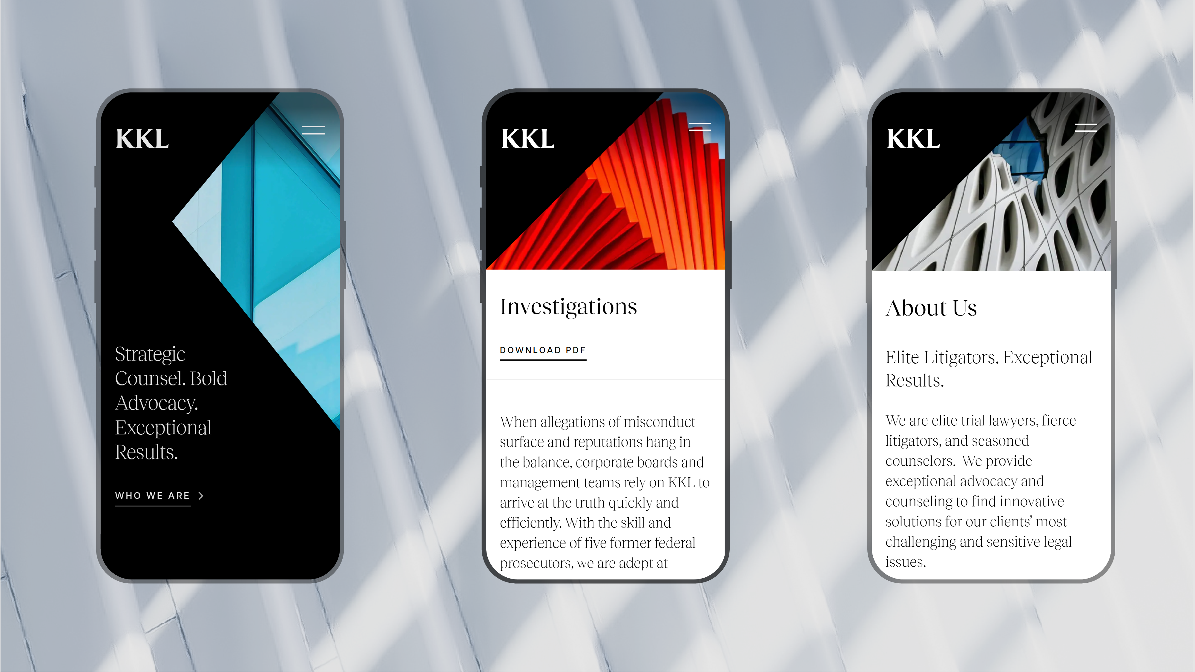 Decker Design repositioned KKL as a modern, prestigious litigation boutique by redefining its brand narrative, restructuring the site architecture, and introducing a contemporary visual identity.