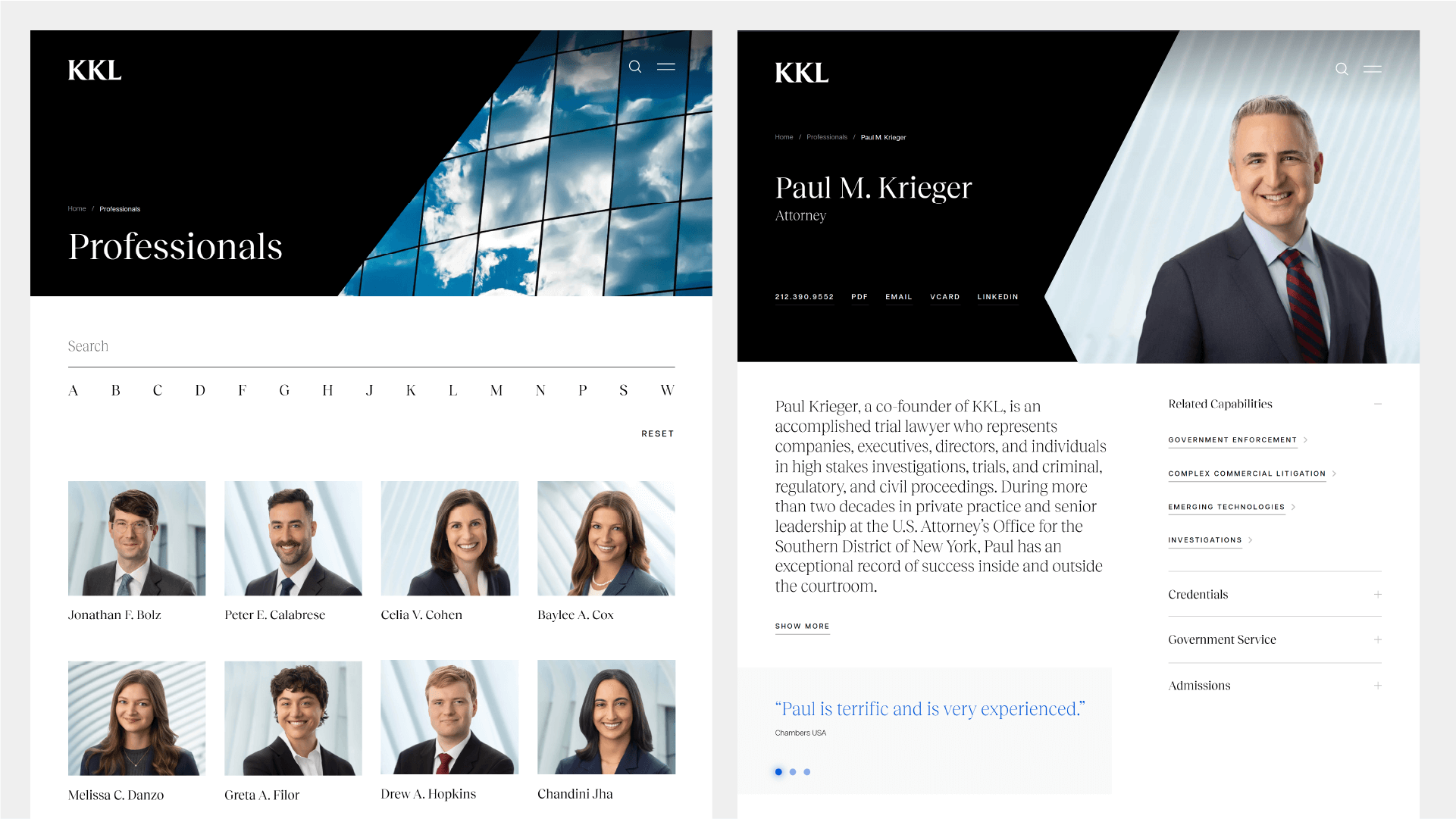 Throughout the redesign, the guiding principle was strategic alignment: the website needed to support KKL’s expansion into civil litigation, strengthen its position among elite referral sources, and appeal to sophisticated clients around the world.